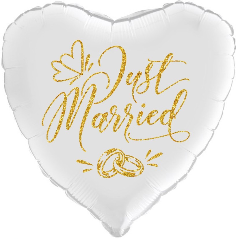 Herzförmiger 18″ großer Folienballon in weiß mit goldenem Aufdruck „Just married“.