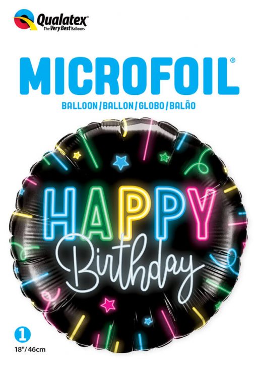 Runder 18″ großer schwarzer Folienballon mit neonfarbenem Aufdruck „Happy Birthday“.