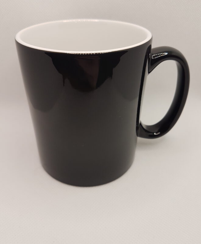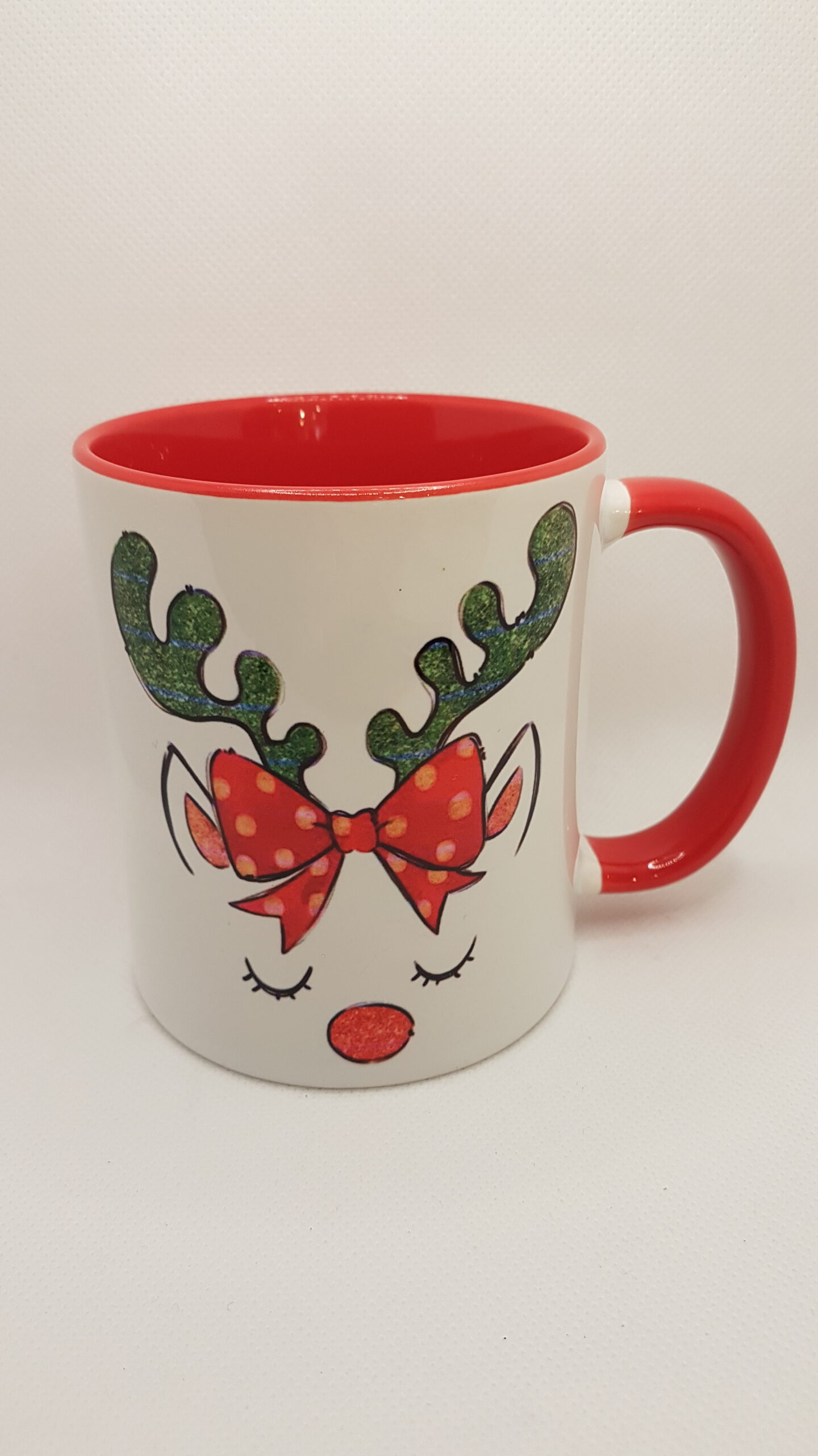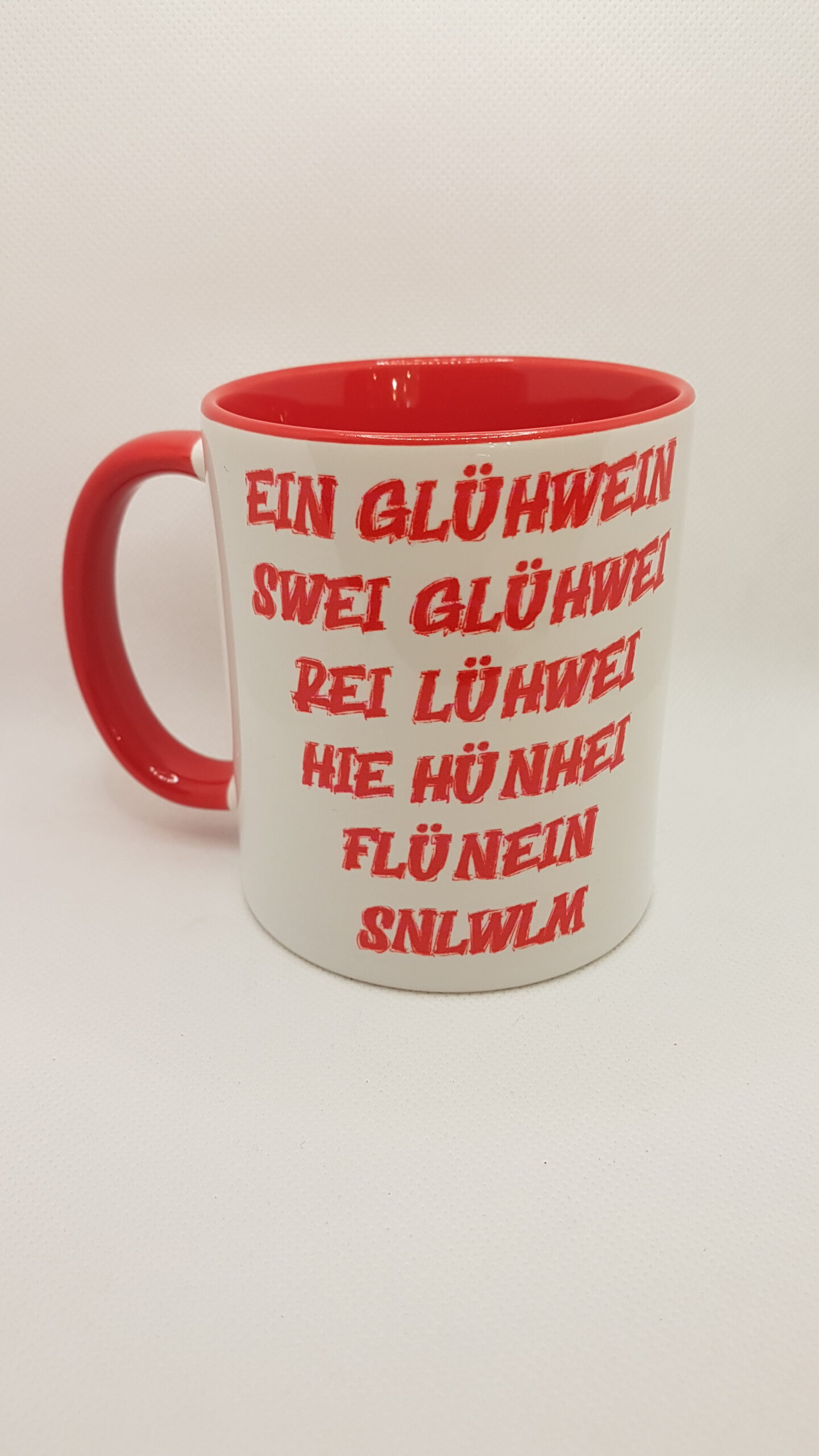 Tasse in rot/weiß mit Glühwein-Spruch und Rentier.