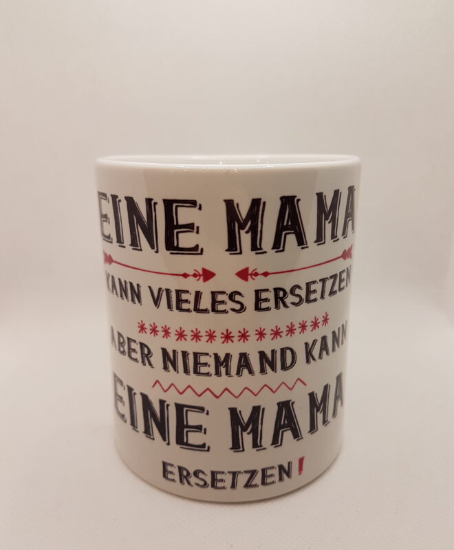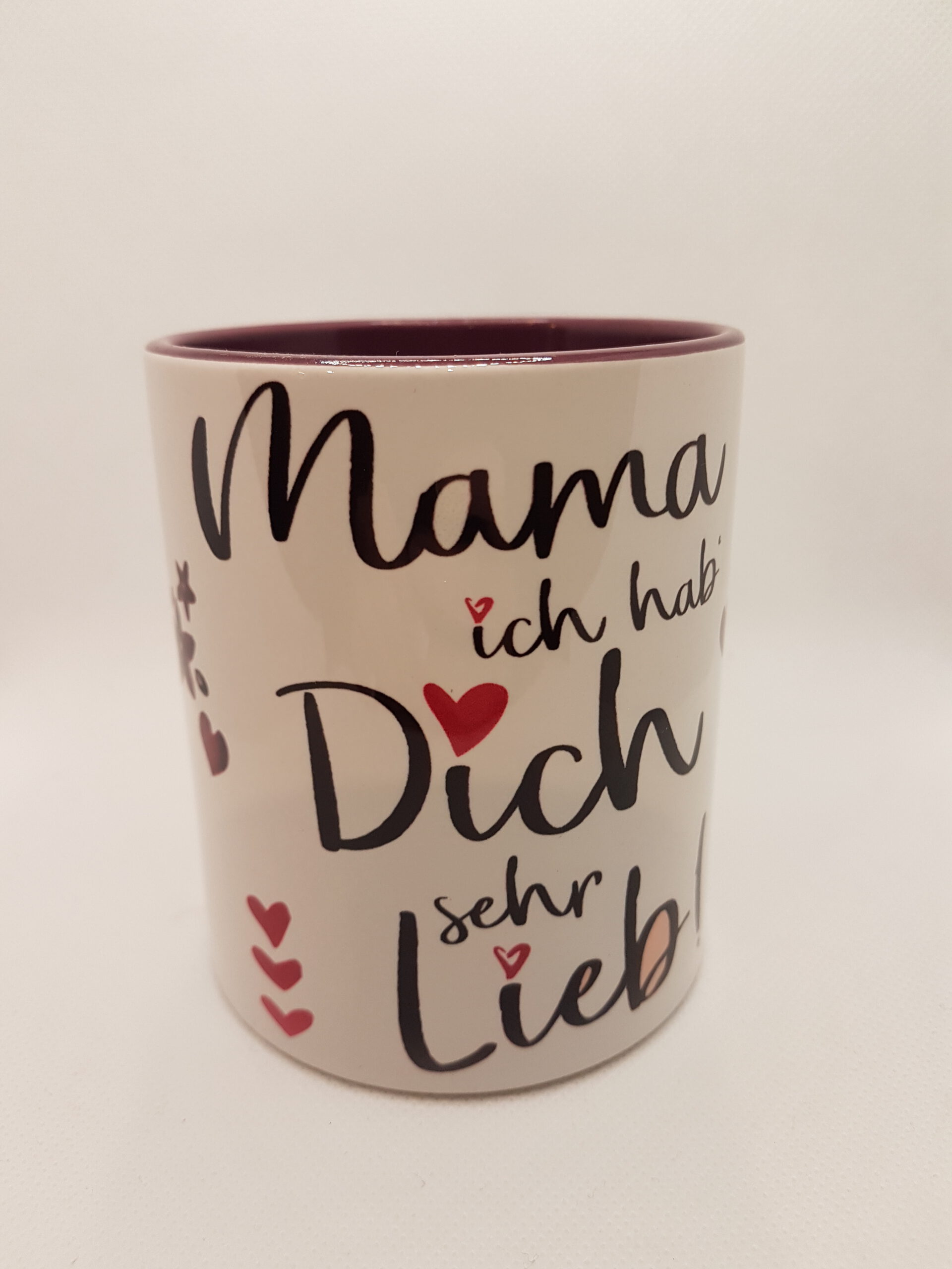 Weiße Tasse mit Henkel und Innenseite in Lila, mit dem Text „Mama ich hab` dich sehr lieb!“